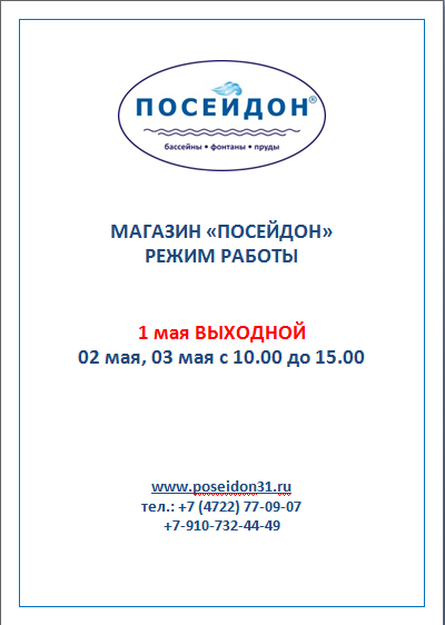 Белгородская обл., г. Белгород, ул. Лермонтова 49а. +7 (4722) 77-09-07, E-mail: market@poseidon31.ru